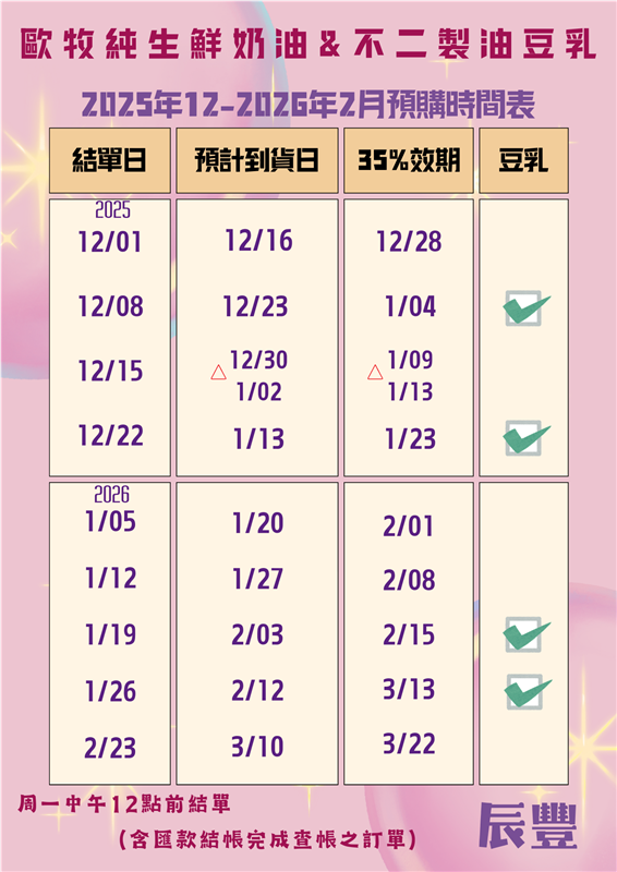 《商品預訂》2025年12月份和2026年1~2時間表▲(歐牧)純生鮮奶油與(不二製油)豆乳系列